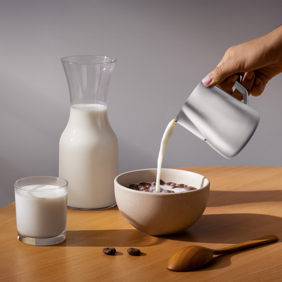 Kvalitní nerezová ocel. Na vnitřní části je cejchovaná odměrka pro přesné dávkování tekutin. Praktická rukojeť a tvar pro jednoduché nalévání. Dostupné objemy: 350 ml, 600 ml, 900 ml, 1000 ml, 1500 ml. Vhodná pro profesionální provozy i běžné domácí použití. Ideální na servírování teplého a nebo studeného mléka, smetany nebo přípravu napěněného mléka při podávaní kávy. Vhodná do myčky na nádobí.